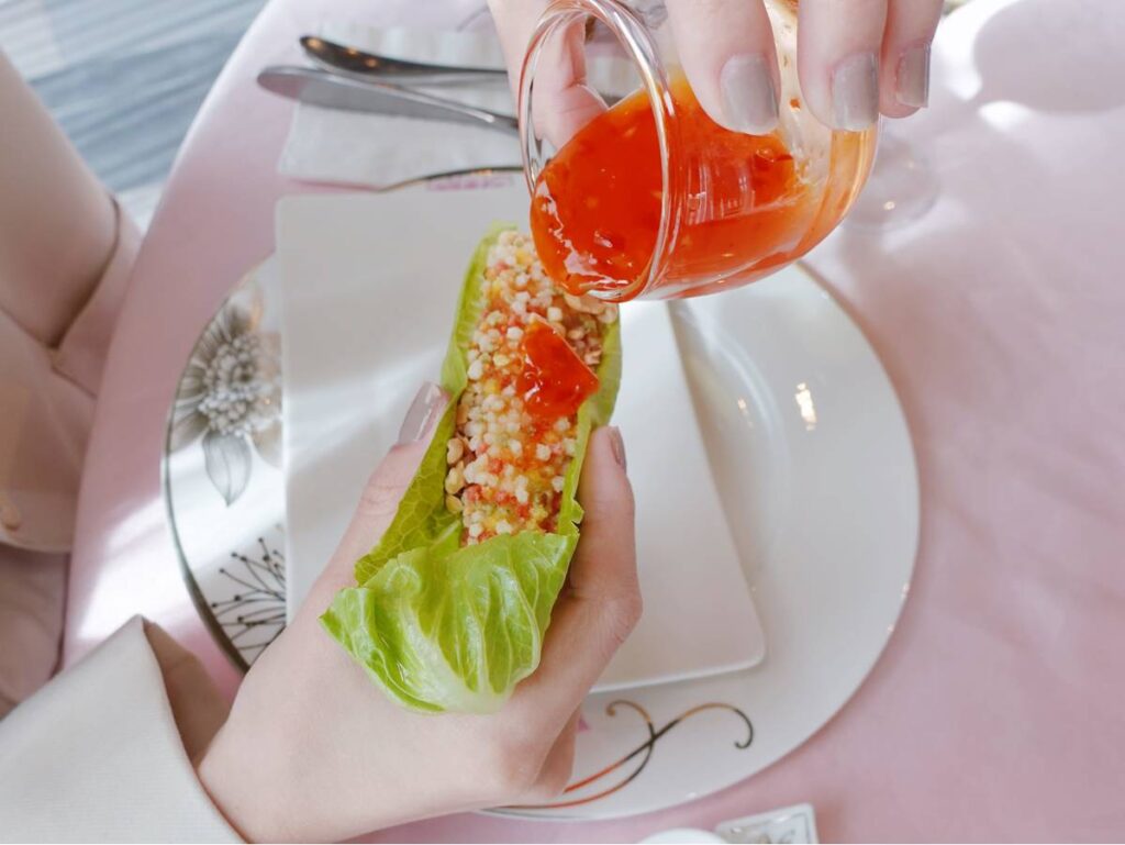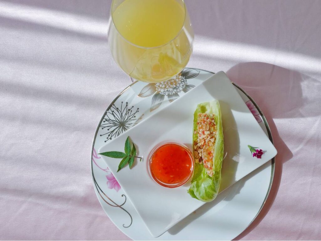 米香外觀結合鮮魚,並搭配新鮮生菜與泰式酸甜醬,
