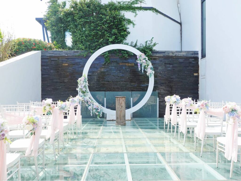 與玻璃和透明地板輝映出超美光芒,超唯美而夢幻感十足的戶外觀禮場地。
