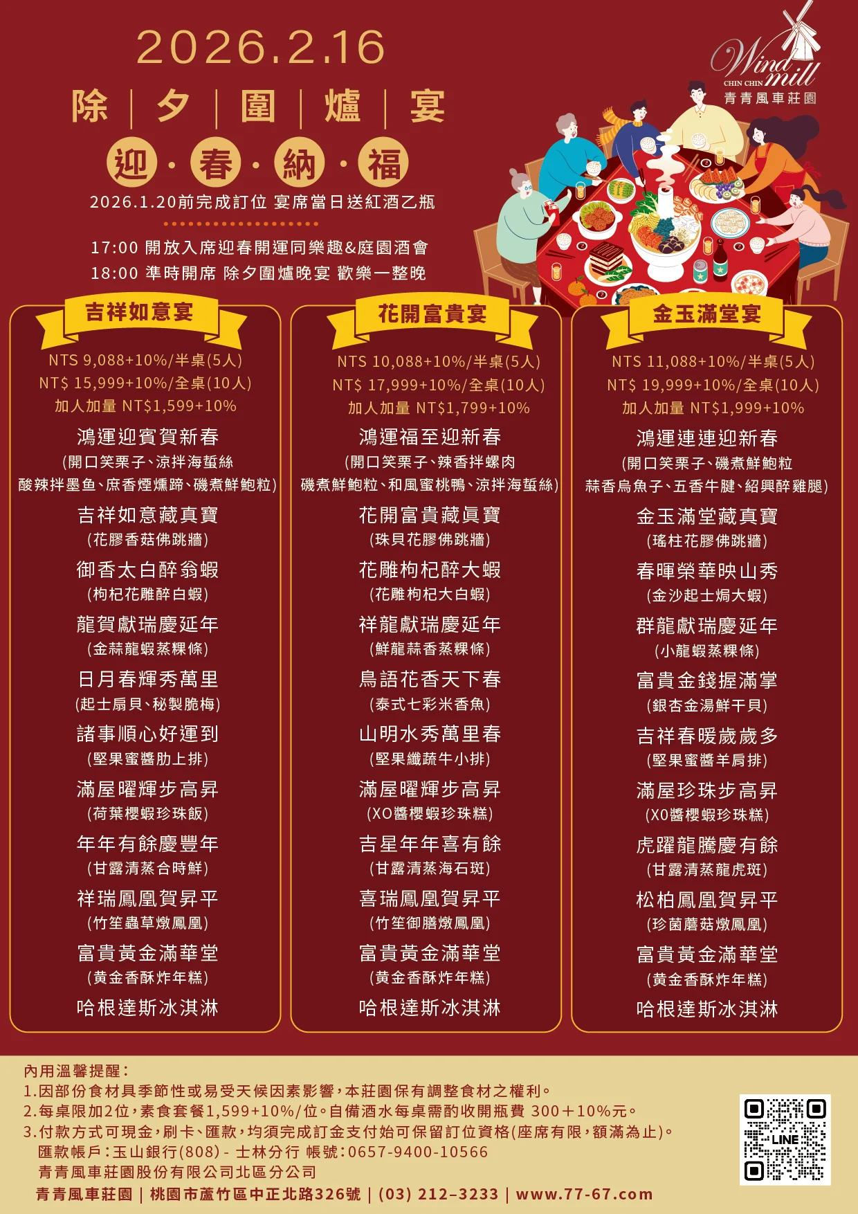 親愛的朋友們,青青風車莊園餐廳誠摯邀請您一同來品味我們獨家打造的除夕圍爐桌菜!新年夜,我們將為您呈現傳統中國年菜的精華,包括鮮美的龍蝦、滋補的燉品和口感鮮美的海鮮。