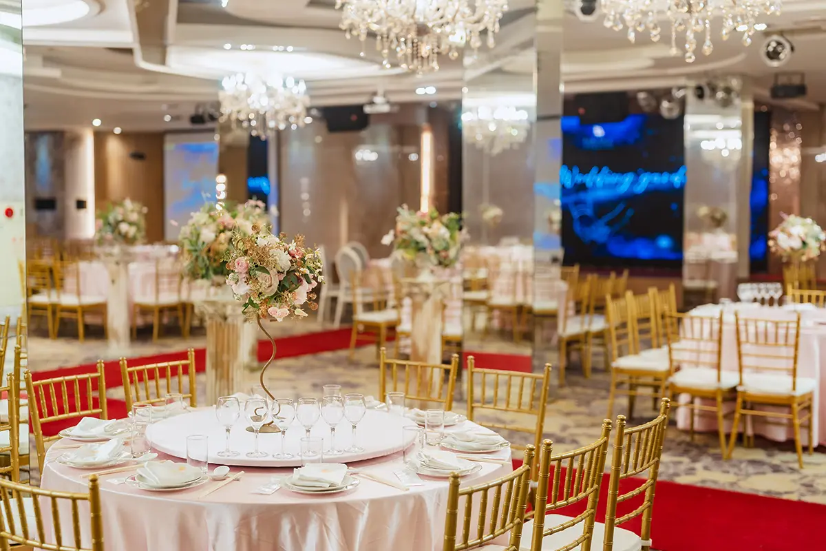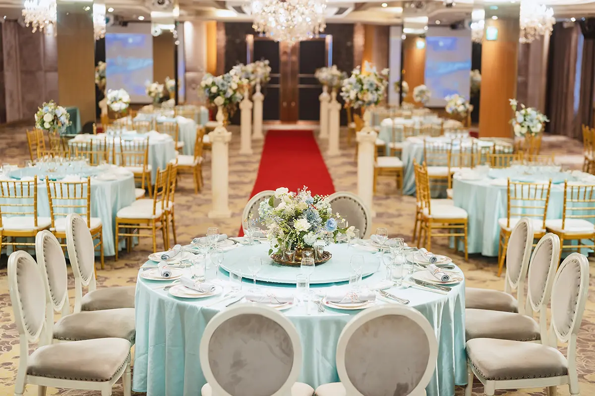 愛麗絲廳,一個從青青格麗絲莊園綻放出的童話世界,這裡的每一個細節都彷彿是從愛麗絲夢遊仙境中翻頁而出。柔美的白色椅套與天空藍的飾帶相映成趣,營造出一片清新脫俗的童話空間。