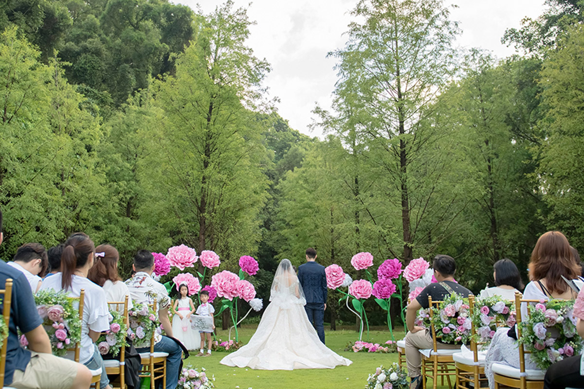 「森語誓約」+「奧朵兒婚禮」,以七千坪落羽松森林為證婚主場,搭配專業音響系統與夢幻佈景,最多可容納500位賓客,氣勢與溫度兼-青青食尚花園會館