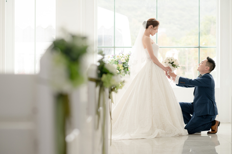 今天回訪娘家青青風車莊園的新人,是去年 10 月剛完婚的敏豪與玟蒨,眼見新娘玟蒨才踏進 Lobby ,就三步併作兩步衝向青青的兩位婚顧夥伴依琪與珮瑤,送上一個大大擁抱,吱吱喳喳熱絡地聊起來,不知道的人肯定以為是閨密相見歡,瞬間填滿整個空間的歡笑,便是這對新人婚禮故事最好的開場白!