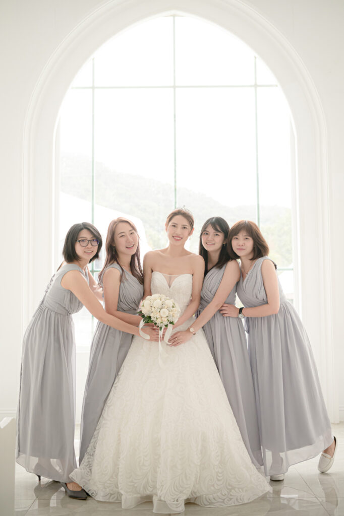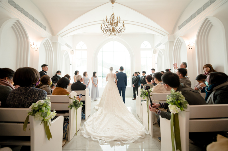 森之教堂外觀宛如白色城堡,內部以溫暖的象牙白為主色調,搭配璀璨典雅的水晶吊燈,證婚台後方的全景落地窗,不僅帶來了充足的自然採光,一大片綠地樹海也成為儀式中最好的襯底。