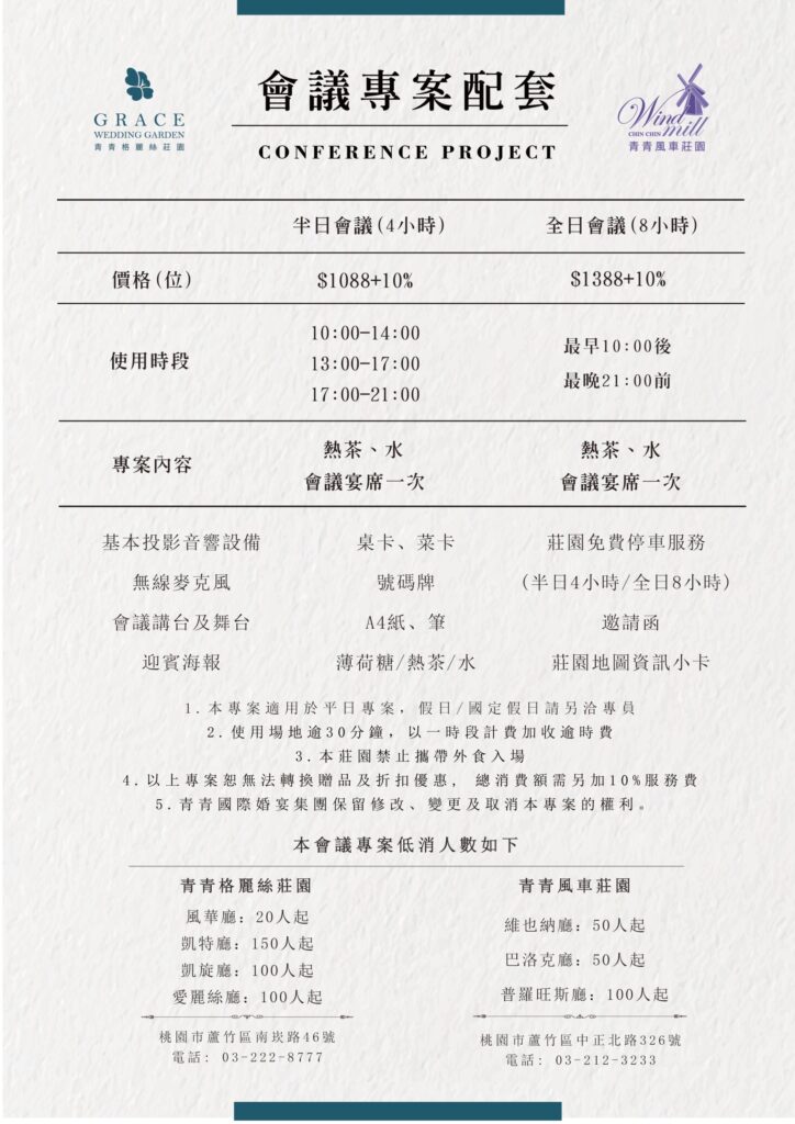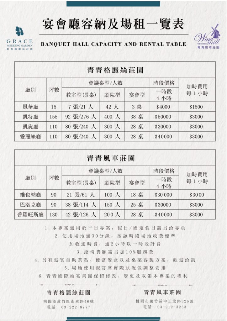 3.逾時本莊園有權中止使用或更換場地以確保下個場次客人使用權益。場地使用視訂席實際狀況做調整安排