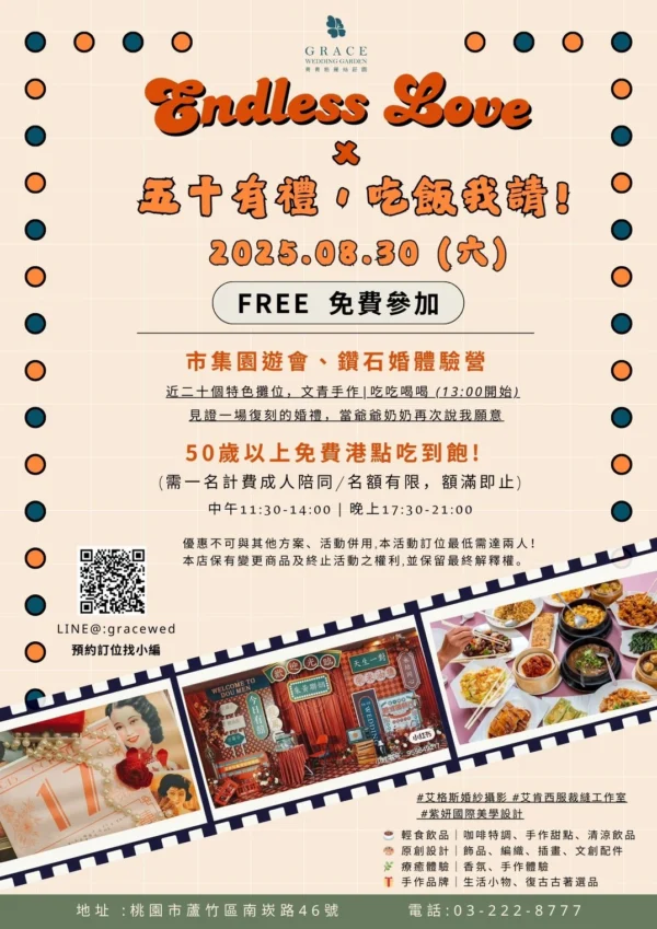 位於桃園蘆竹的青青格麗絲莊園,不僅是許多新人浪漫婚禮的理想場地,同時更提供極具特色的港點百匯吃到飽! 8月30日將首度舉辦 「青青格麗絲市集體驗日」。莊園方表示,這場以 《Endless Love無盡的愛 × 50 有禮‧吃飯我請》 為主題的夏末慶典,結合親情、愛情與社區市集元素,希望讓三代同堂的家庭一次感受「逛市集、參觀婚禮、品嚐港點」的多重體驗。