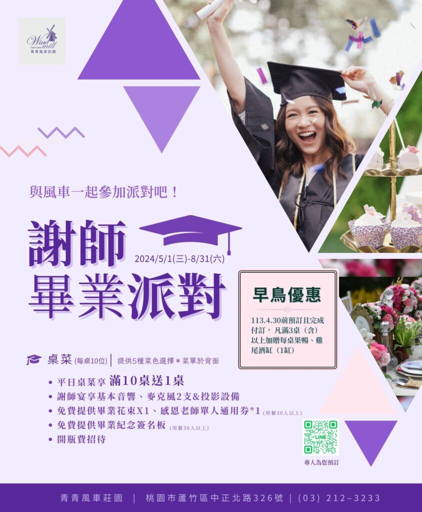 風車莊園多功能的空間規劃可配合服務各種不同活動需求,從少桌數單一班級、系所,到多桌適合全年級、校友聯誼、跨校合辦謝師宴等活動都有場地可供服務,並有相關影音設備可供租用,讓畢業師生共享美景佳餚,為畢業生在有歡笑有淚水的學生生涯留下最後的燦爛回憶。