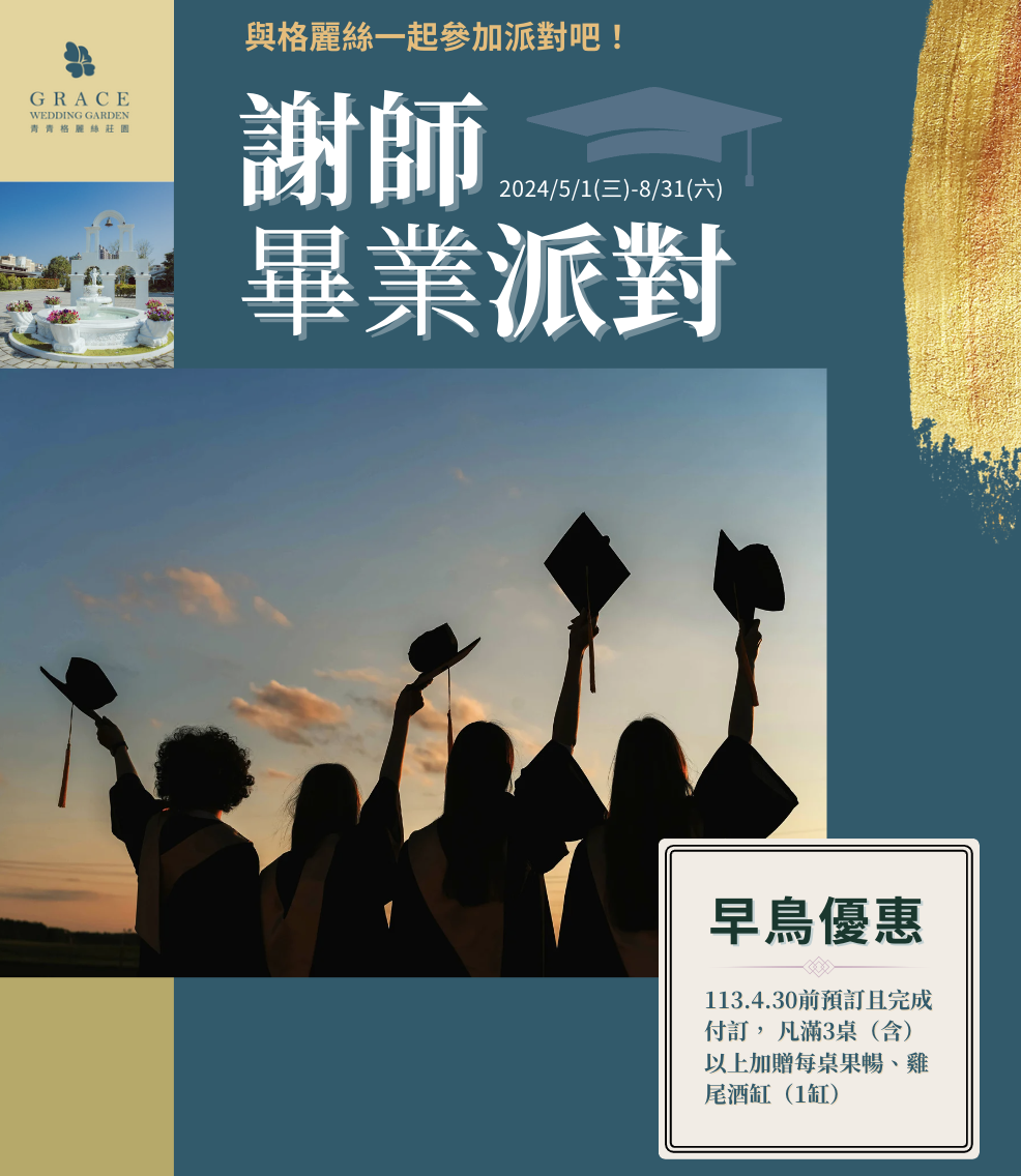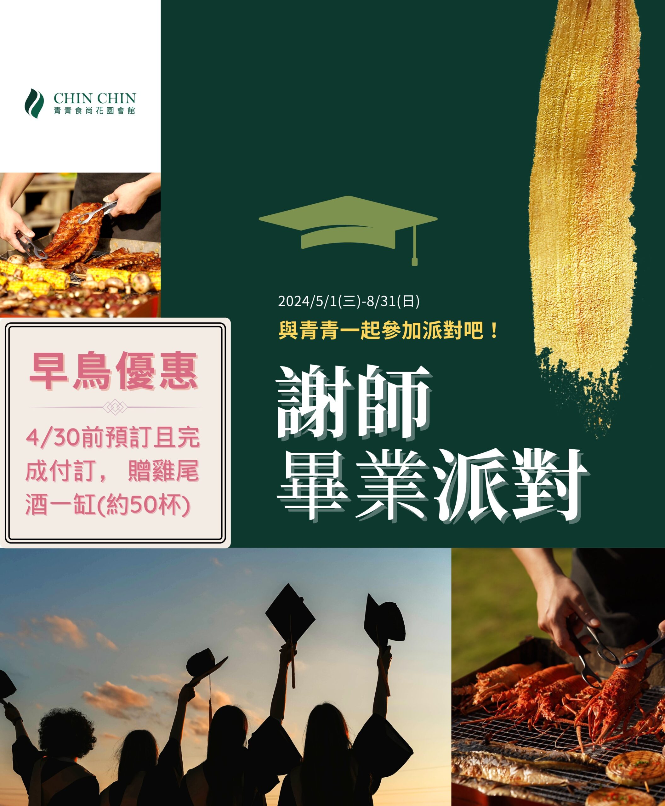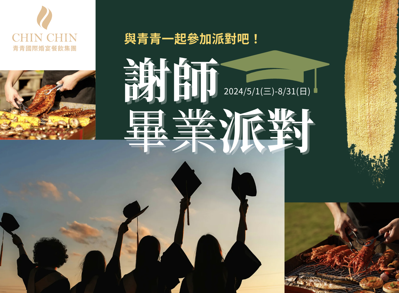 想為老師們送上一份特別的感謝嗎?想與好友們共度一個難忘的畢業派對嗎?現在正是時候!青青國際婚宴餐飲集團旗下3館特別為您呈上最豐盛的謝師宴及畢業派對,讓您的畢業時刻更加難忘!