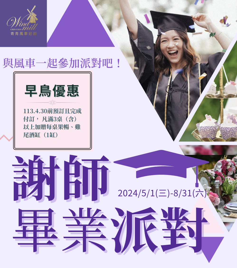 在畢業季活動期間,台北青青食尚花園會館、格麗絲莊園/風車莊園以及港點百匯將為您帶來特別的活動。